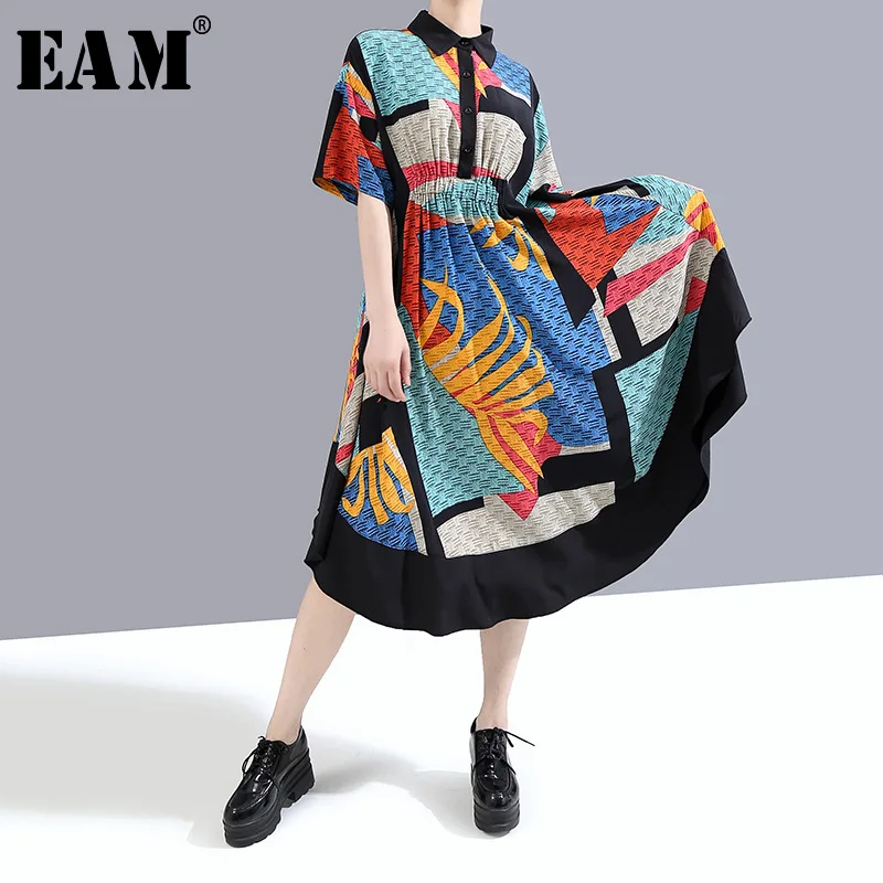 Женское платье-рубашка EAM, синее длинное платье с ассиметричным принтом и коротким рукавом, 1W339, 2020