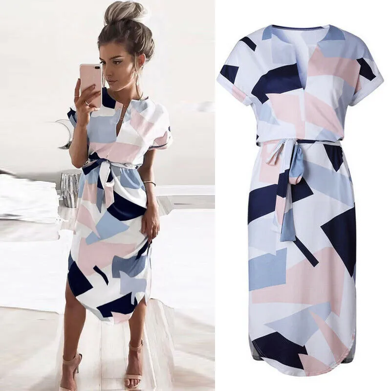 Летнее платье 2019 женское богемное стильное пляжное платье с геометрическим принтом элегантные вечерние платья с поясом Vestidos de fiesta плюс раз...