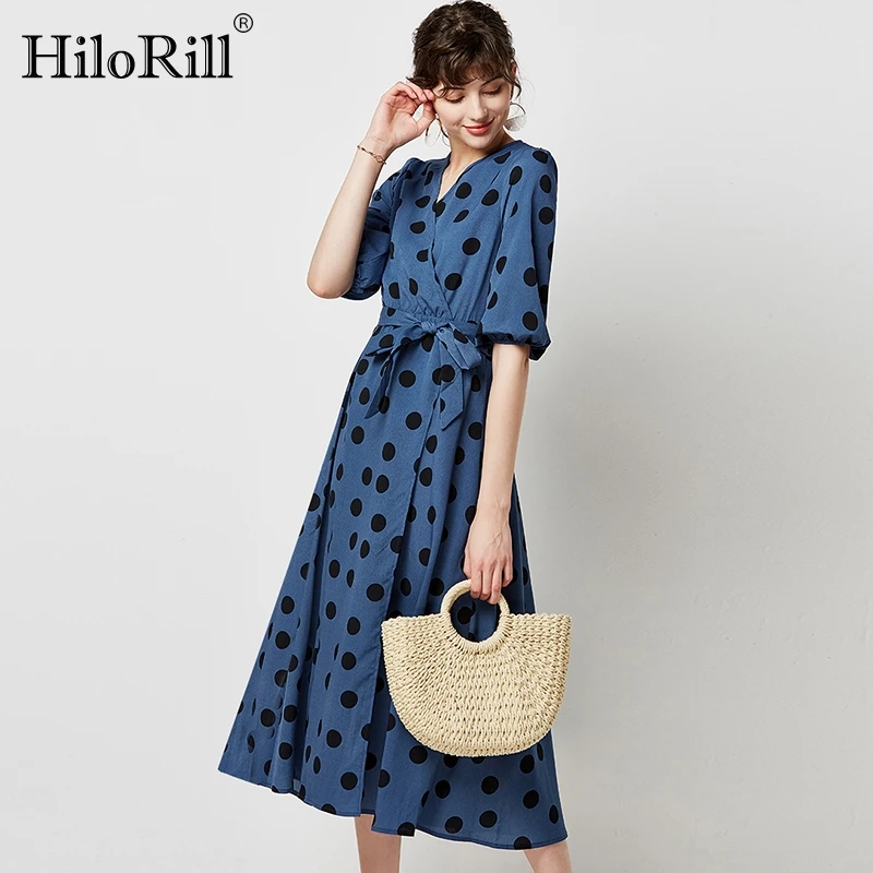 Винтажные платья в горошек для женщин с рукавами-фонариками 2020 сексуальное вечернее платье миди с v-образным вырезом повседневное Элегантное Длинное платье с поясом