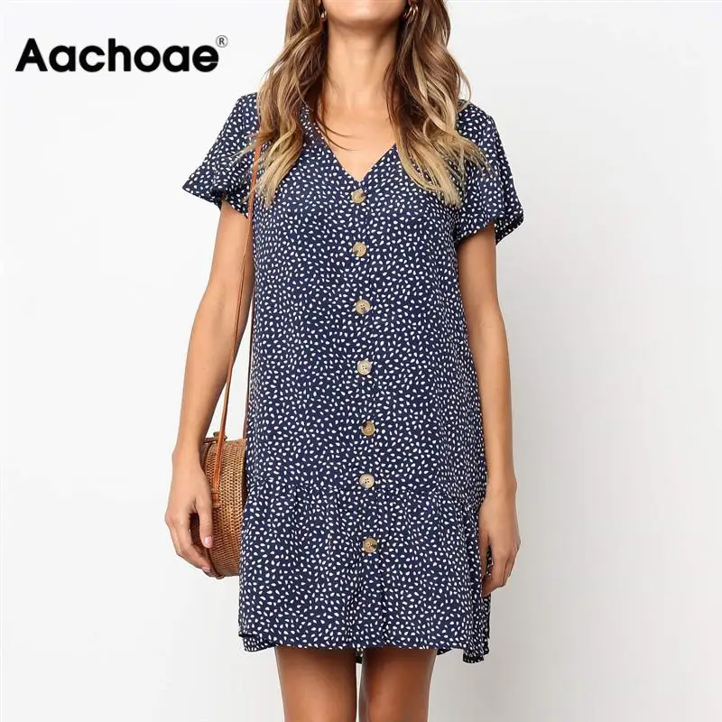 Женские платья лето 2019 богемное гофрированное платье в горошек с принтом на пуговицах с v-образным вырезом с коротким рукавом повседневное ...