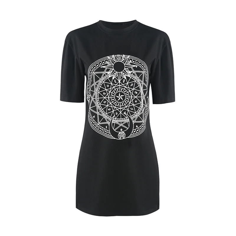 Новое Женское платье Свободный Готический символы Луна солнце печати летние платья короткий рукав с круглым вырезом прямое мини-платье