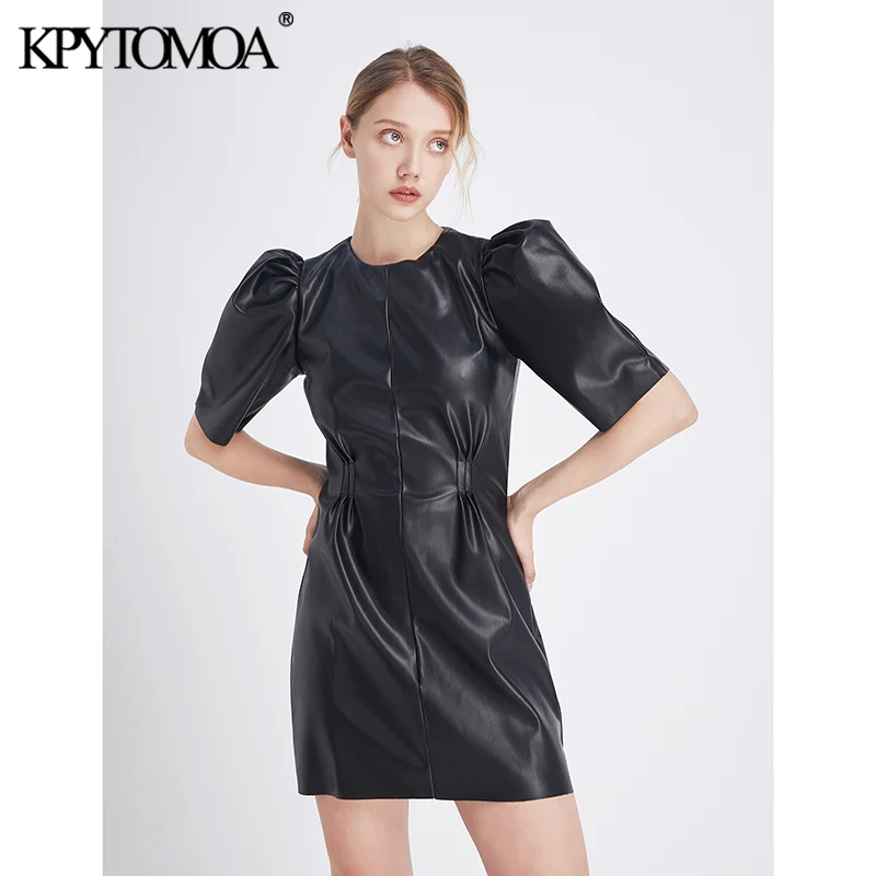 Винтажное стильное Плиссированное мини-платье из искусственной кожи 2020 модное женское платье с круглым вырезом и пышными рукавами на молнии сзади из искусственной кожи Vestidos