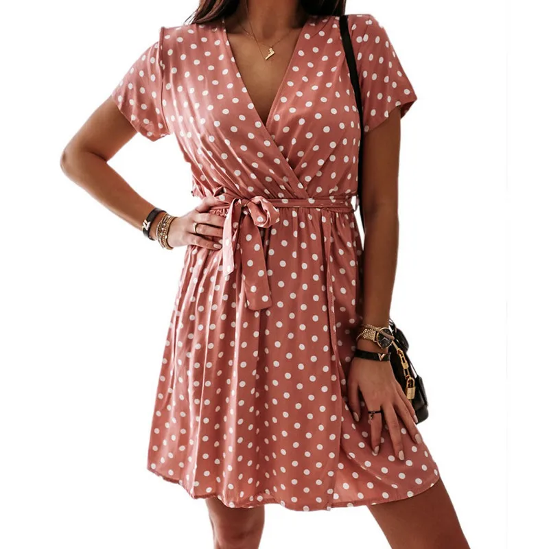 Женское летнее платье в горошек с коротким рукавом и v-образным вырезом, свободное повседневное вечернее мини-платье, вечерние платья
