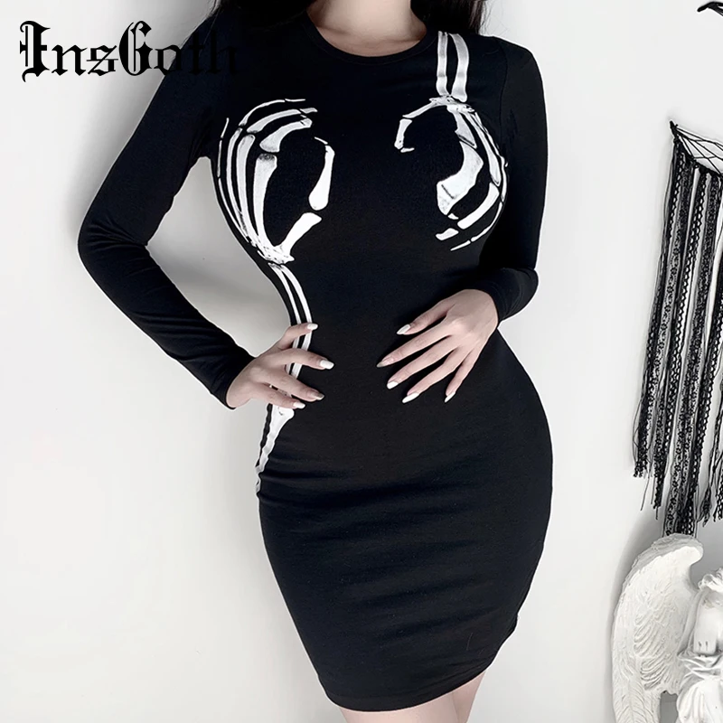 InsGoth черное облегающее платье с длинным рукавом для женщин Готическая уличная одежда с принтом черепа мини вечерние женские платья