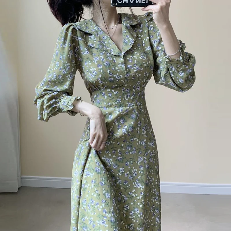 Романтическое шифоновое платье с цветочным принтом и лацканами в южнокорейском стиле для ранней весны