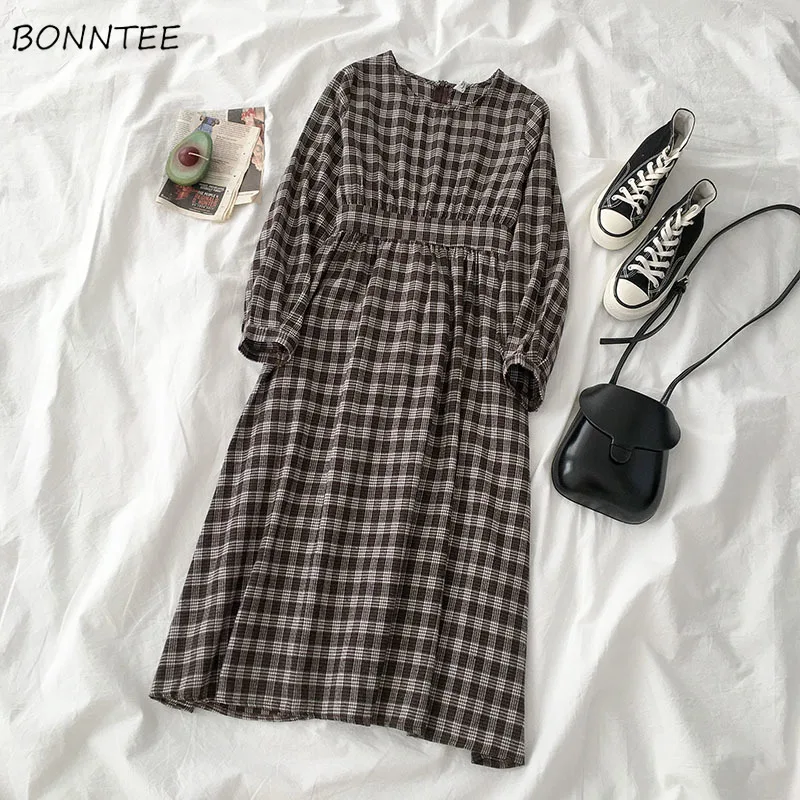 Женское платье с длинным рукавом, повседневные платья в клетку, Женская винтажная корейская мода, высокое качество, Круглый ворот, женское, ...