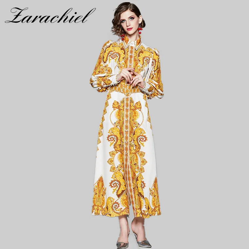 Женское однобортное Платье макси с рукавами-фонариками, винтажное длинное платье золотистого барокко с пуговицами на пуговицах, 2019
