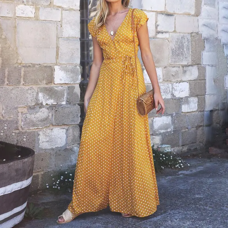 Женские длинные платья в горошек с коротким рукавом, высокая талия, глубокий v-образный вырез, на шнуровке, макси платье для женщин 2020, летняя одежда для женщин, есть в наличии