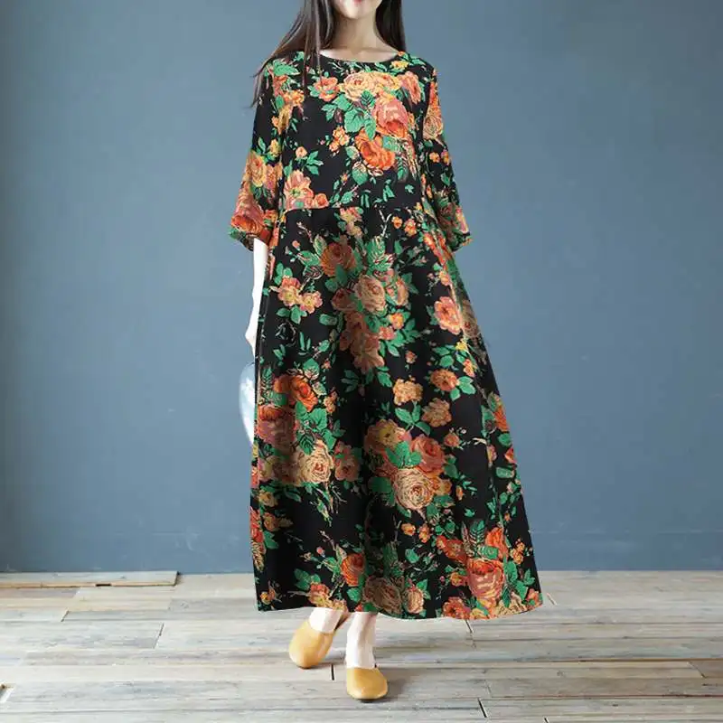 Летнее винтажное хлопковое льняное длинное платье с цветочным принтом, ZANZEA, женское платье с рукавом 3/4, сарафан в стиле ретро, платья размера плюс, кафтан, Vestido