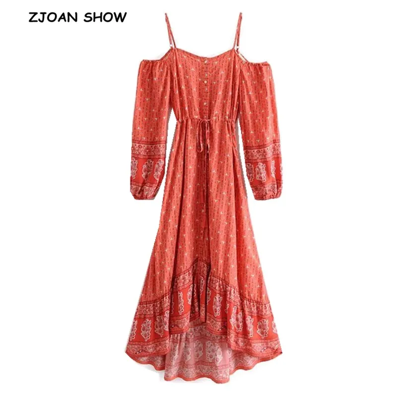 2019 богемные пуговицы цветочный принт с длинным рукавом с открытыми плечами женское платье со шнуровкой на талии качели асимметричные плать...