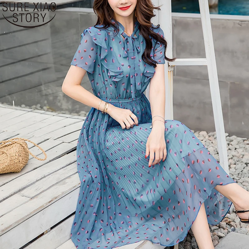 Женское платье Лето 2019 с коротким рукавом А-силуэта милое однотонное шифоновое платье с круглым вырезом модное тонкое богемное пляжное дли...