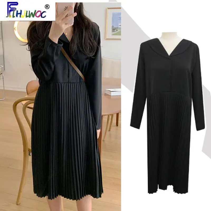 Плиссированные черные платья Горячая Распродажа Женская мода 2020 Flhjlwoc дизайн корейский темперамент леди Кнопка рубашка платье длинное 4104