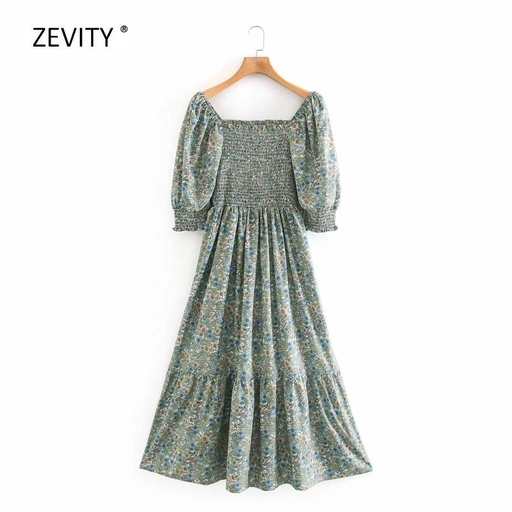 Женское винтажное эластичное платье миди с квадратным воротником и принтом в стиле ретро, плиссированное платье с пышными рукавами, модель 2020, DS3939