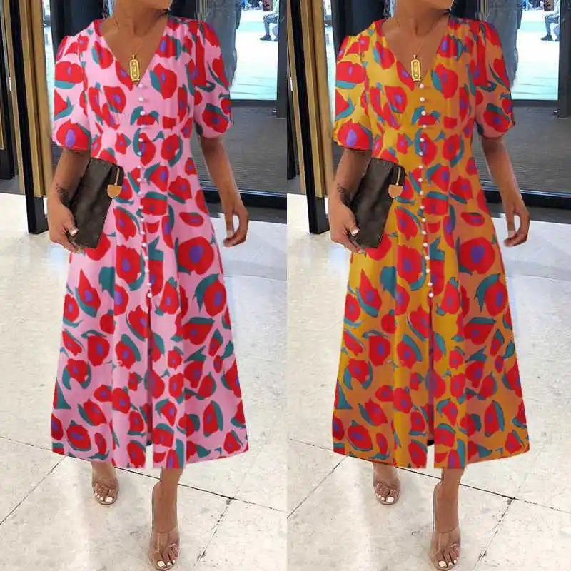 Женское платье с принтом размера плюс, модное платье с коротким рукавом и разрезом по подолу, сарафан с v-образным вырезом, летнее праздничное платье на пуговицах, 7
