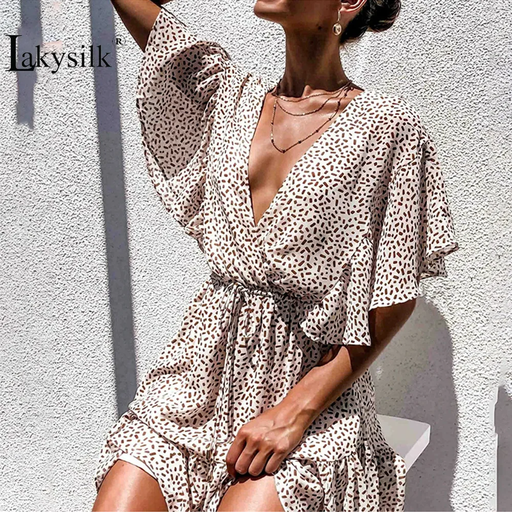 Сексуальное платье с глубоким v-образным вырезом, леопардовое мини-платье с коротким рукавом, летнее пляжное платье трапециевидной формы с открытой спиной и высокой талией, тонкое платье с оборками