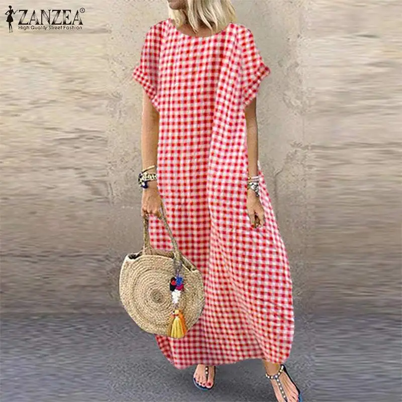 Винтажный женский клетчатый сарафан ZANZEA 2019 летнее платье в клетку повседневное с коротким рукавом макси Vestidos кафтан женский халат негабари...