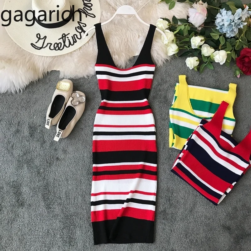 Gagarich сексуальное Полосатое трикотажное платье 2020 летнее модное цветное без рукавов с v-образным вырезом элегантное облегающее платье средней длины Vestidos