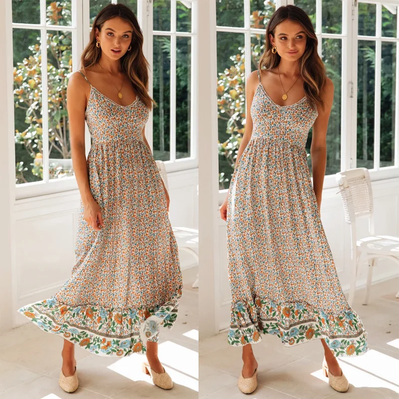 Женское пляжное сексуальное платье трапециевидной формы с открытой спиной и бретельками, женское платье с v-образным вырезом без рукавов, элегантное платье с принтом L264