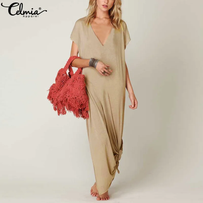 Женское длинное платье-рубашка Celmia, свободное пляжное платье с v-образным вырезом и коротким рукавом, пляжный сарафан большого размера, лето 2020