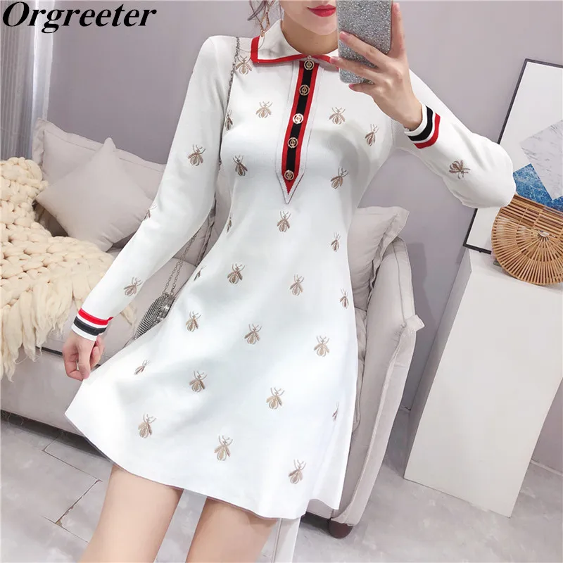 Весна-лето, новинка, подиумный дизайн, темперамент, Золотая Пчела, вышивка, отложной воротник, короткое/с длинным рукавом, простое вязаное тонкое платье