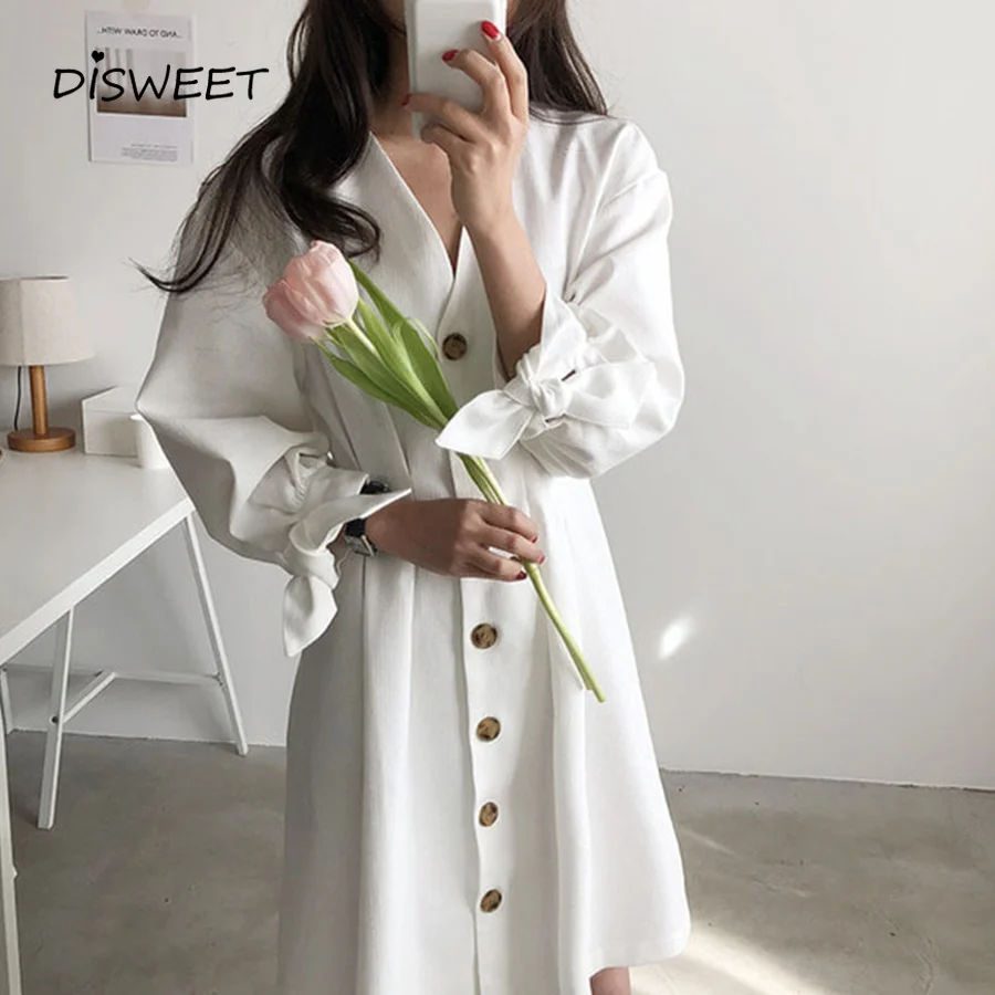 2019 белое платье женское элегантное корейское с длинным рукавом с галстуком-бабочкой платья женские винтажные свободные с v-образным вырезо...