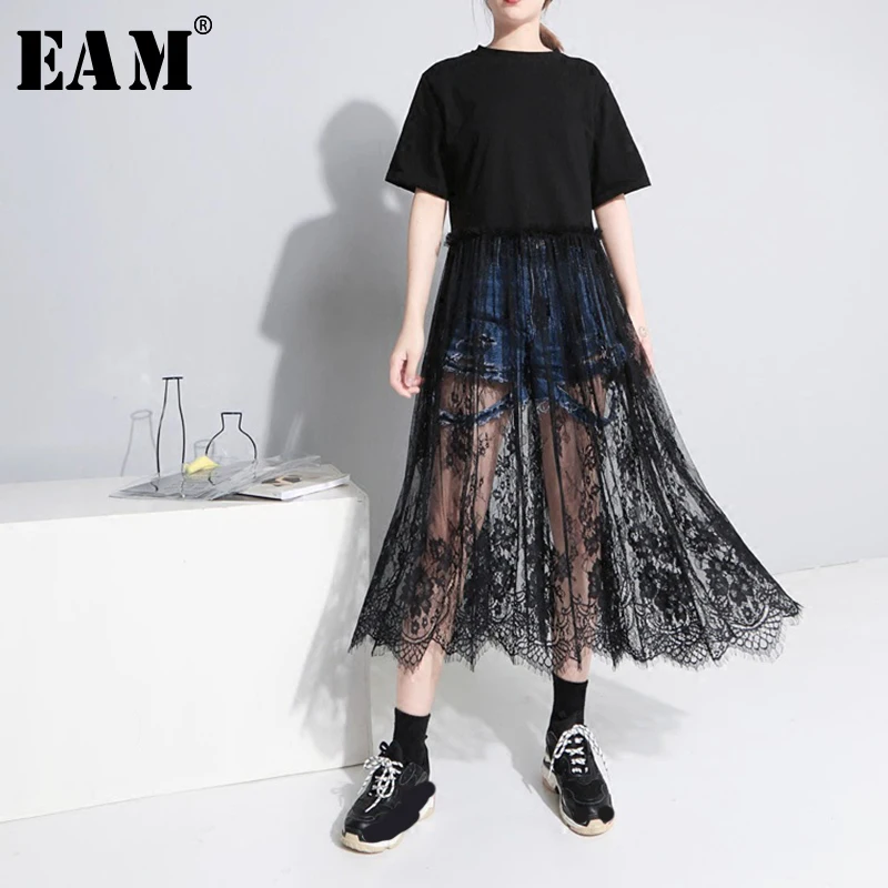 [EAM] 2019 Весна Лето Мода Новые Женские повседневные свободные с коротким рукавом рубашки Lase Hem Patchowrk o-образным вырезом до середины икры платье ...