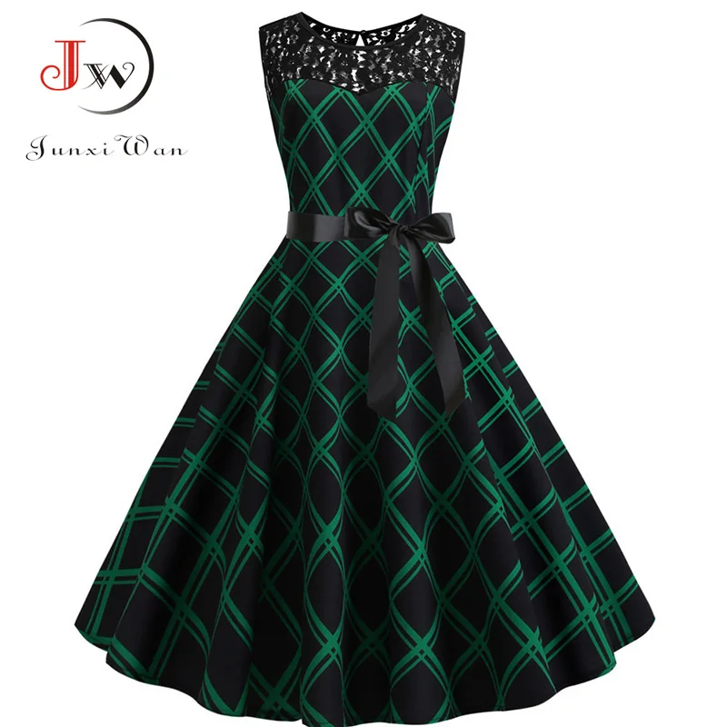 Женское летнее платье в клетку с принтом, 50 s, элегантное винтажное платье, Повседневное платье в стиле рокабилли, кружевное платье в стиле п...