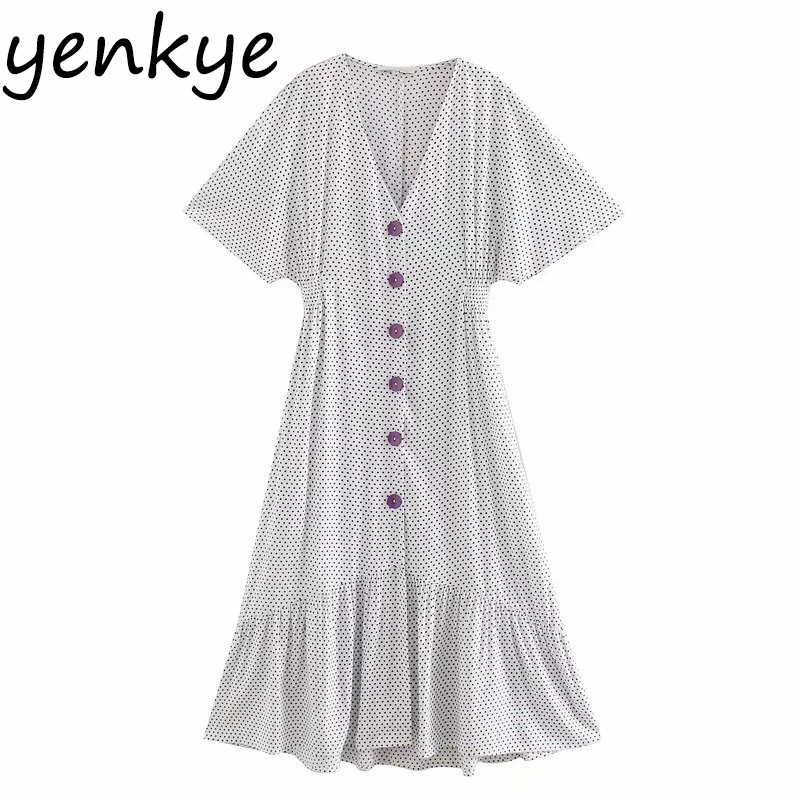 Летние платья 2020 женское винтажное платье в горошек с пуговицами спереди милое женское платье с v-образным вырезом и коротким рукавом облегающее длинное платье трапециевидной формы Сарафан