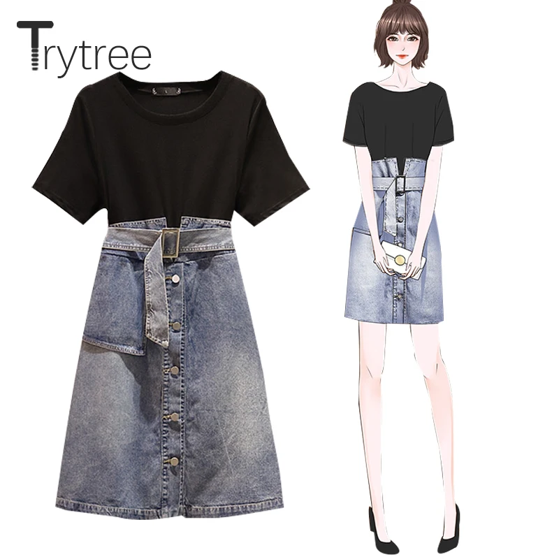 Trytree 2020 летнее женское Повседневное платье с круглым вырезом, лоскутное Ковбойское платье с карманами, однобортное свободное модное платье из двух предметов
