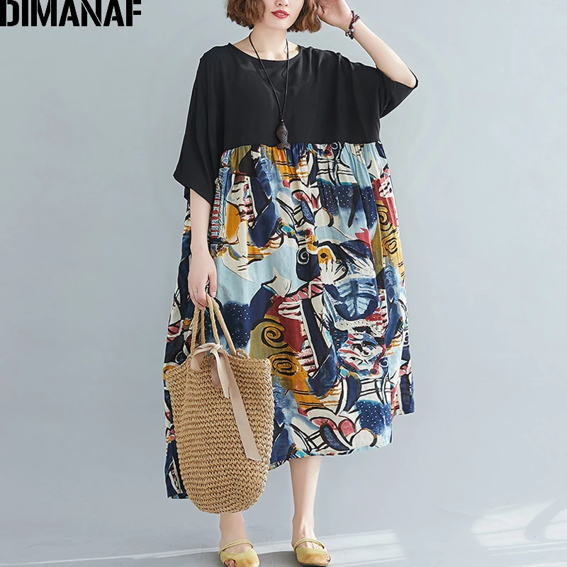 Женское винтажное платье DIMANAF, повседневное свободное платье большого размера из хлопка, черный сарафан большого размера
