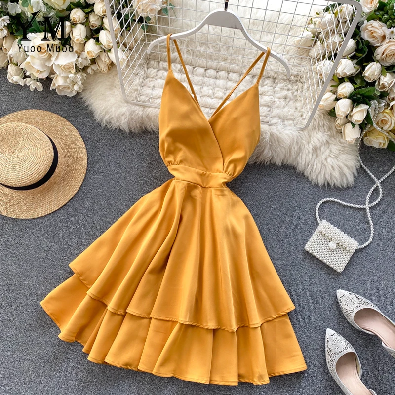 YuooMuoo Ins модное сексуальное Бандажное пляжное платье с открытой спиной и бантом женское короткое летнее платье-туника с v-образным вырезом на тонких бретельках с двойными оборками