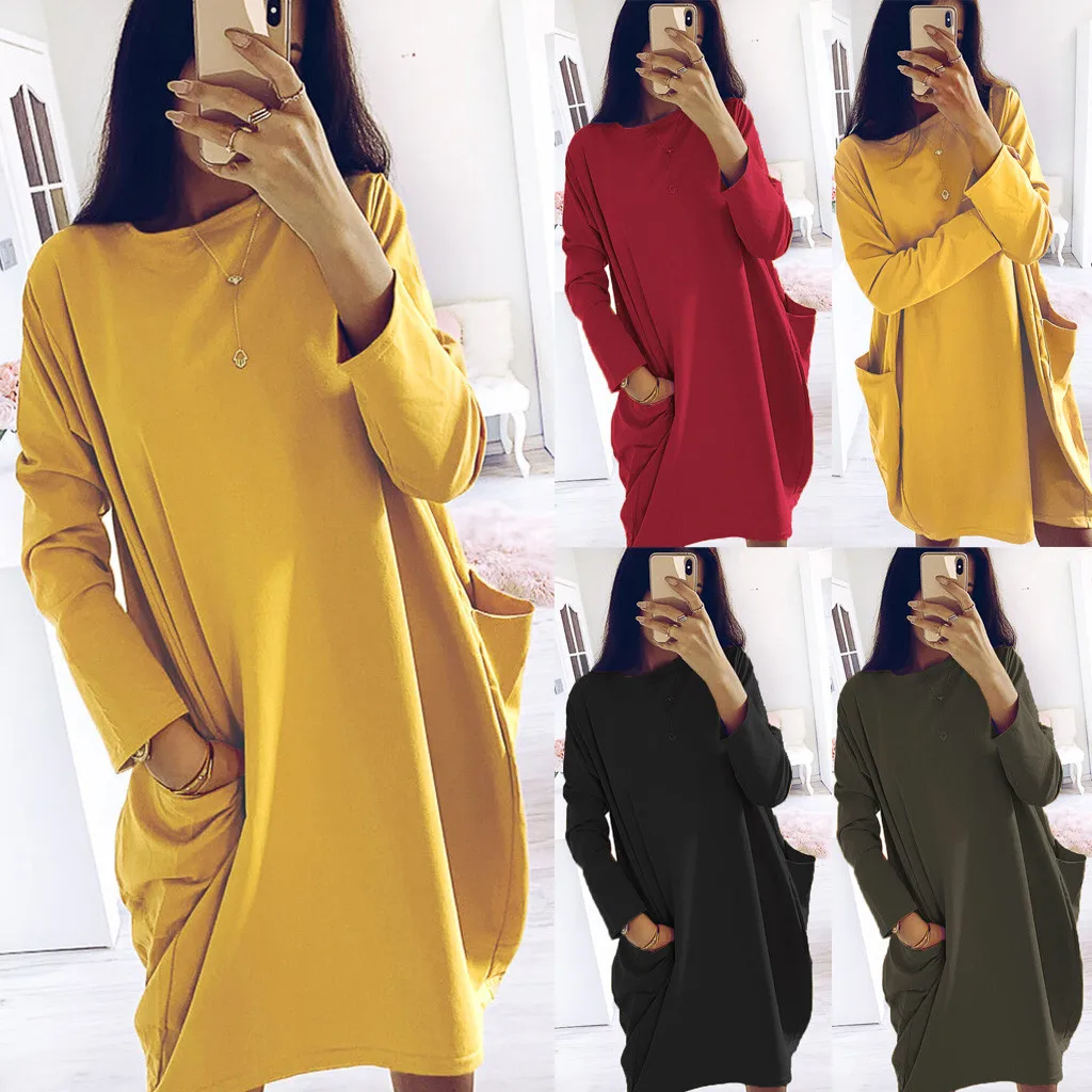 Вечерние платья размера плюс для женщин, длинный рукав, карманы, туника, топ для девушек, Свободный пуловер, блузка, платье, Vestido de mujer