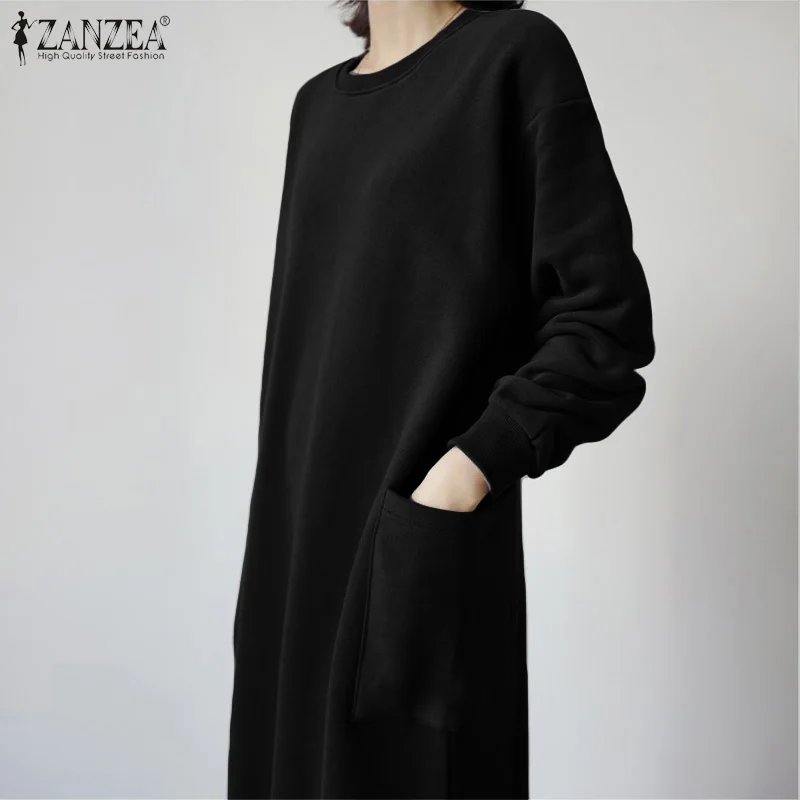 ZANZEA 2020 Spring Women Long Sweatshirt Dress Female Casual Long Maxi Vestidos Ladies Baggy Pockets Split Sundress Solid Robe
