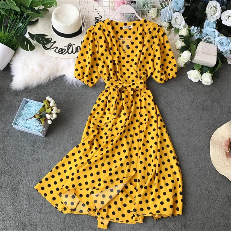 2020 винтажное тонкое летнее платье средней длины с v-образным вырезом и принтом в горошек, женское элегантное платье с высокой талией для пля...