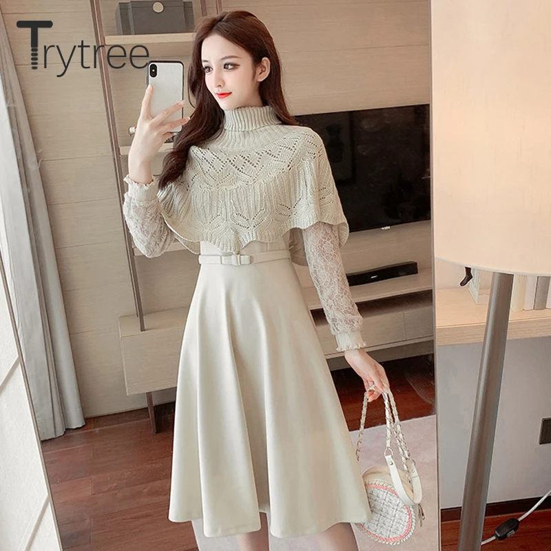 Trytree Осень Зима Женское платье повседневное шаль с отложным воротом кружево лоскутное кнопка пояс 2 цвета ТРАПЕЦИЕВИДНОЕ модное платье по колено