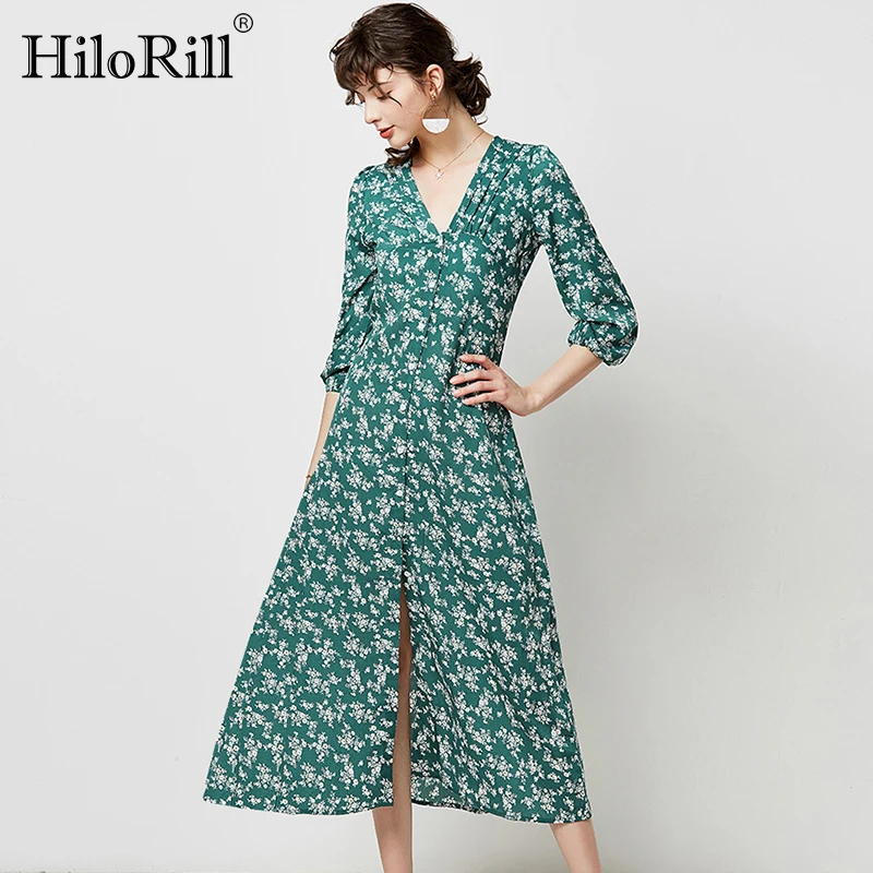 Осеннее элегантное платье миди с цветочным принтом для женщин 2020, v-образный вырез, пуговица, Повседневное платье-туника с рукавом-фонариком, длинное платье в стиле бохо