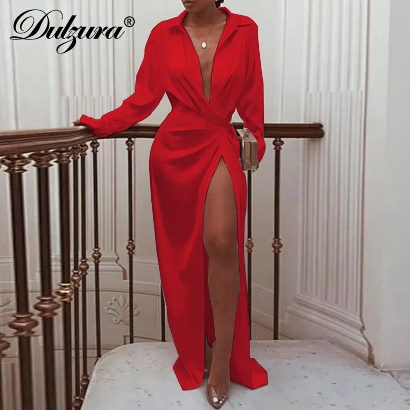 Dulzura атласное Атлас миди с запахом платье-рубашка с длинным рукавом лонгслив с высоким разрезом сексуальные Бандажное вечерние 2019 осень осе...