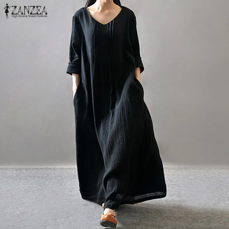Женское элегантное платье 2019 ZANZEA Осень v-образный вырез с длинным рукавом длиной до пола повседневное свободное однотонное Макси длинное пл...