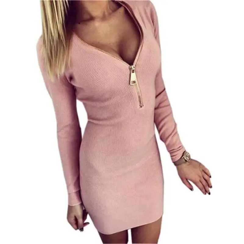 Vestidos Вязание 2019 женские платья на молнии с круглым вырезом сексуальное вязаное платье с длинным рукавом облегающее платье пакет хип платье ...