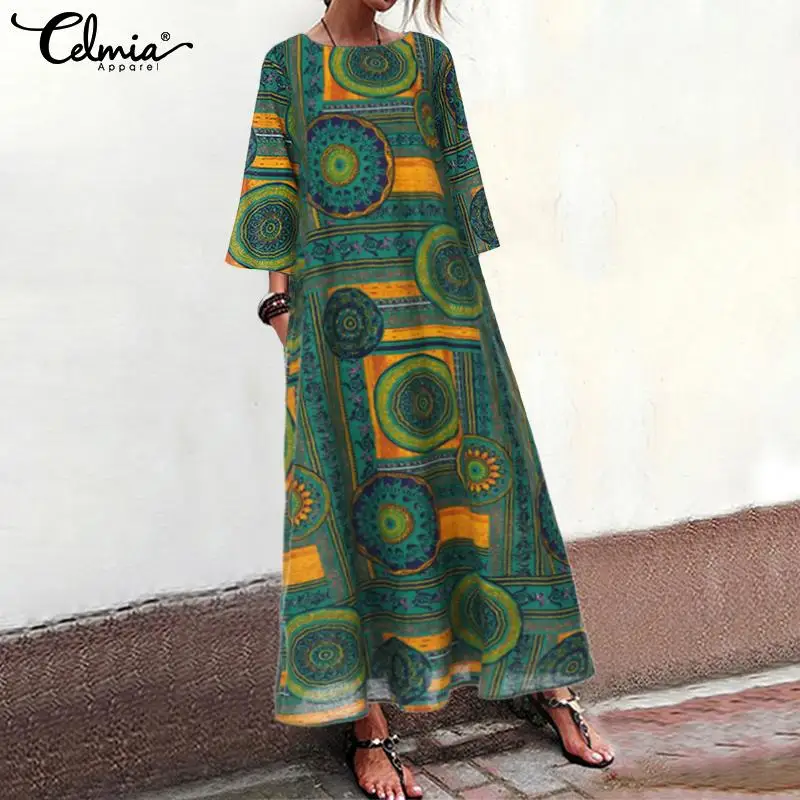 Для женщин Винтаж принт длинное платье Celmia 2019 женские, с расклешенным рукавом Повседневное свободные сарафаны хлопок девечий костюм, накид...
