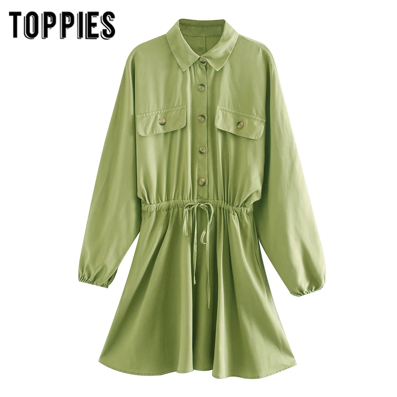 Винтажное зеленое Хлопковое платье-рубашка, женское мини-платье с рукавами-фонариками и пуговицами с эластичной резинкой на талии, vestidos
