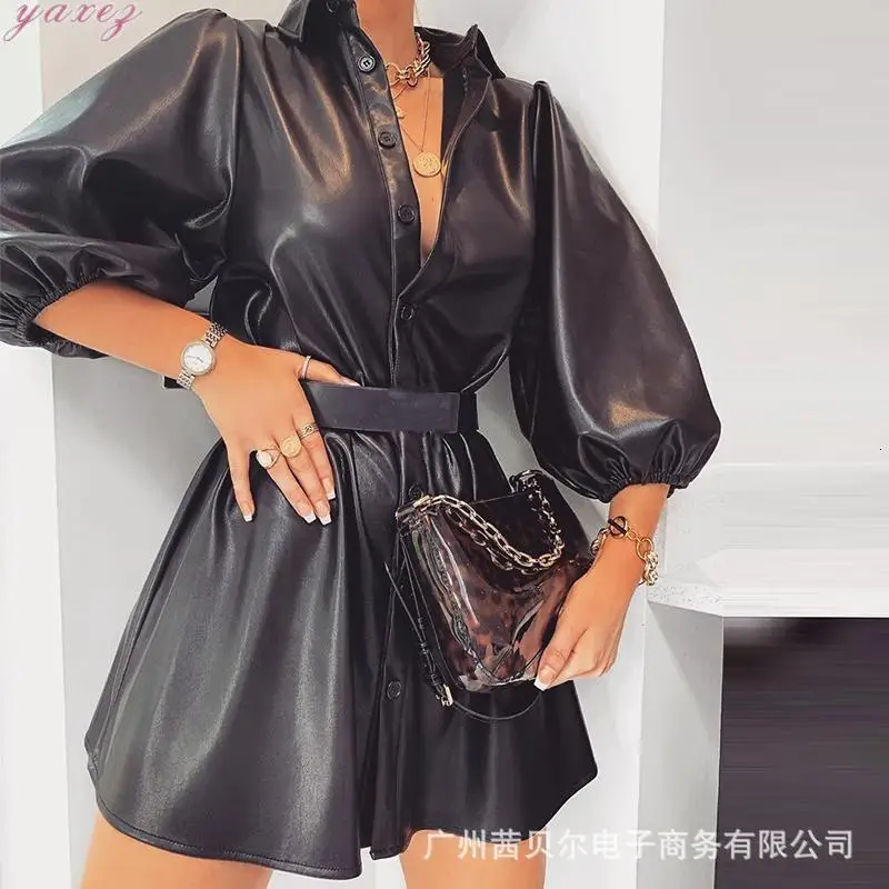 Крутое модное черное яркое женское платье из искусственной кожи, уличный стиль, новый стиль, отложной воротник, пышные рукава, сексуальное Т...
