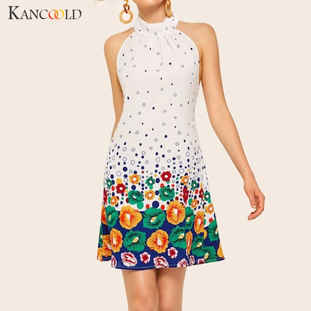 KANCOOLD женское платье с модным принтом, с открытой спиной, с бретельками, без рукавов, Пляжное облегающее мини-платье с бретельками на шее, пов...