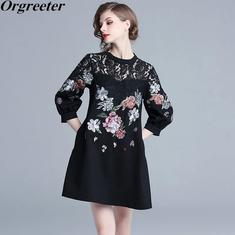 Кружевное платье с цветочной вышивкой, весенне-осеннее сексуальное черное платье с о-вырезом и рукавами-фонариками, выше колена, новое поступление