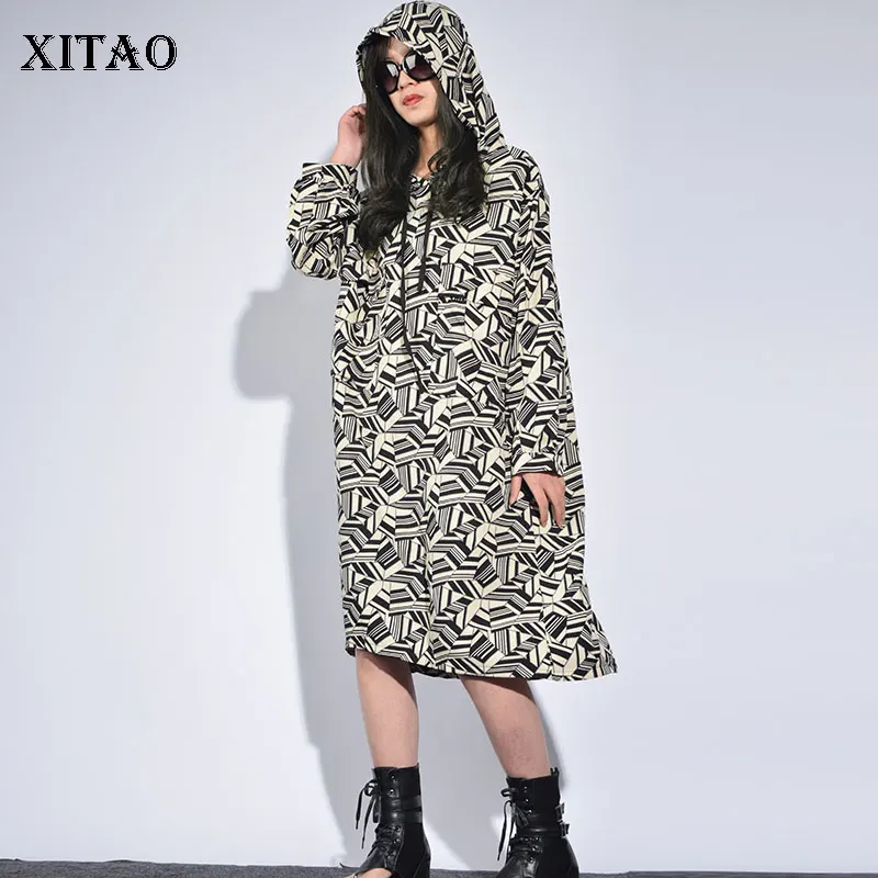 [XITAO] 2019 весна мода с капюшоном воротник длинный рукав Повседневное платье женский геометрический карман лоскутное платье до колена ZLL3150