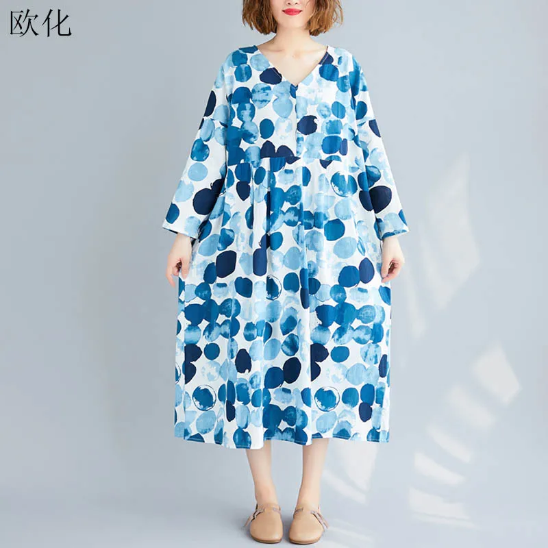 Женское платье в горошек, летнее платье с длинным рукавом размера плюс, хлопковое льняное летнее платье, женское свободное винтажное длинное платье макси, 4XL 5XL 6XL