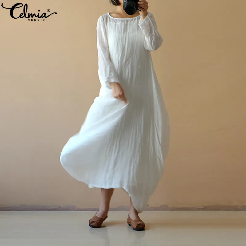 Женское льняное платье в стиле ретро, лето 2019, стильное, повседневное, с круглым вырезом, с длинным рукавом, Длинные Макси платья, кафтан, ...