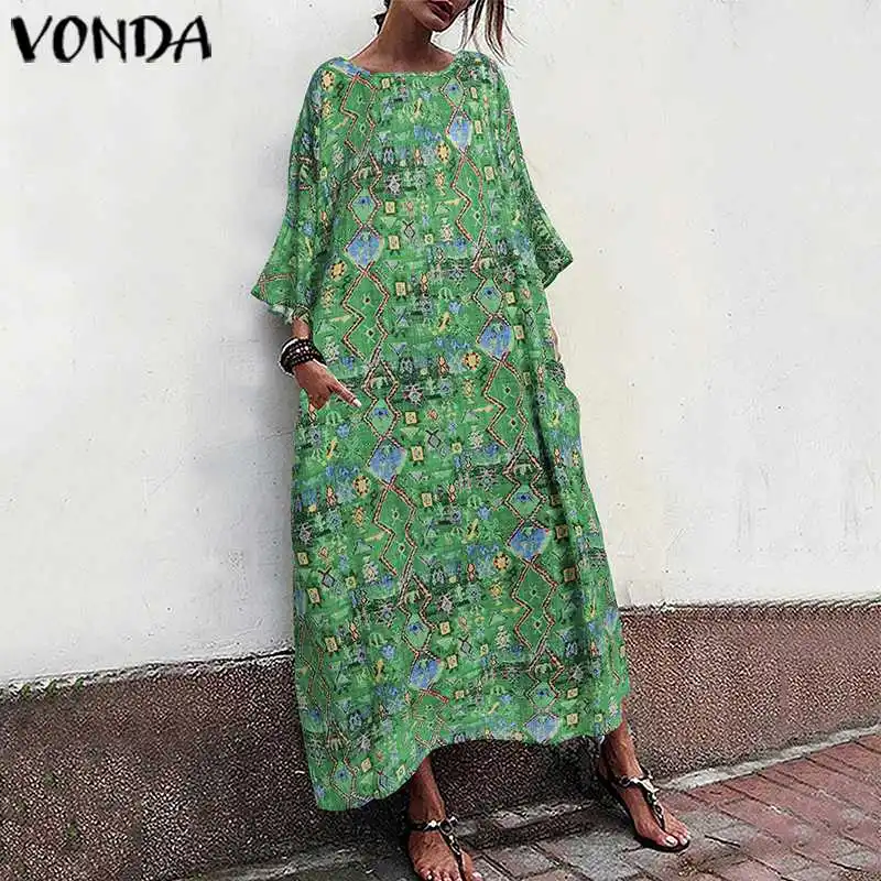 Женское платье большого размера с принтом Макси длинное платье VONDA 2019 Летний Сарафан женский винтажный 3/4 расклешенный рукав свободные вече...