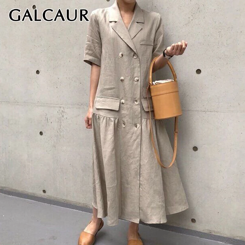 Женское винтажное платье с двойными пуговицами GALCAUR, длинное платье с отложным воротником и коротким рукавом, с высокой талией, 2020, Новинка