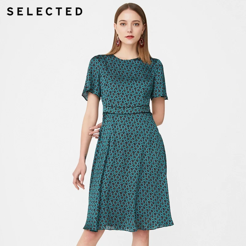 Выбранное летнее приталенное платье миди с круглым вырезом и принтом S | 41922J532